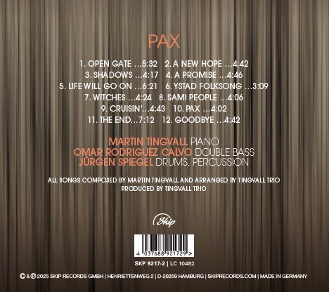 Seit mehr als zwei Dekaden ist das Tingvall Trio ein zuverlässiger Garant für packenden Piano Trio Jazz mit griffigen Melodien und kraftvollen Rhythmen.  Achtmal wurden ihre Produktionen mit dem Jazz Award in Gold ausgezeichnet, ihr letztes Album „Birds“ erreichte wiederum die No.1 der Deutschen Jazz Charts und ausverkaufte Konzerte in ganz Europa zeugen von der Popularität der drei Wahl – Hamburger. Zur Vorbereitung des neuen Longplayers „Pax“ spielte das Trio Anfang des Jahres eine mehr als 20 Termine umfassende Konzerttournee, an deren Ende die Drei direkt in Ihr Lieblingsstudio, das ARTE SUONO von Klangmeister Stefanio Amerio in Italien, gingen. Das Resultat ist ein Album, das fast so energetisch aber auch zerbrechlich klingt wie ein Live-Konzert. Nie wurde das Trio  im Studio so schnörkellos eingefangen, ob in berührenden Balladen wie „A Promise“ oder typischen TT-Losgehnummern wie „Cruisin“.